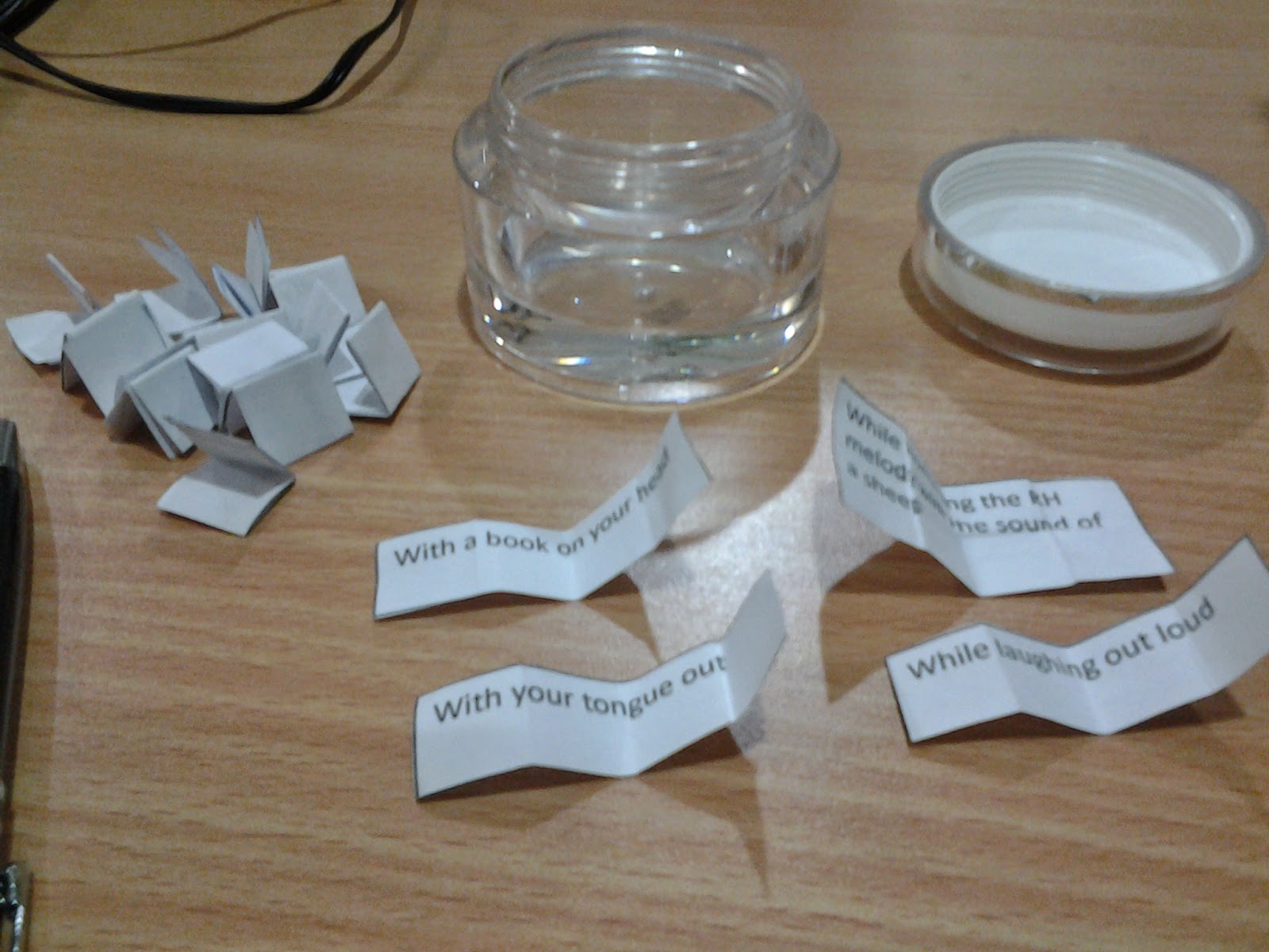 Cara Membuatnya pun sangat mudah. Yang perlu dilakukan hanyalah kreatifitas dalam membuat tantangan bagi anak dalam bermain musik. Kertas yang telah diisi tantangan, dilipat dan dimasukkan ke dalam kotak. Tantangan ini dilakukan sambil bermain alat musik. Berikut ini ide tantangan yang bisa dipakai:
