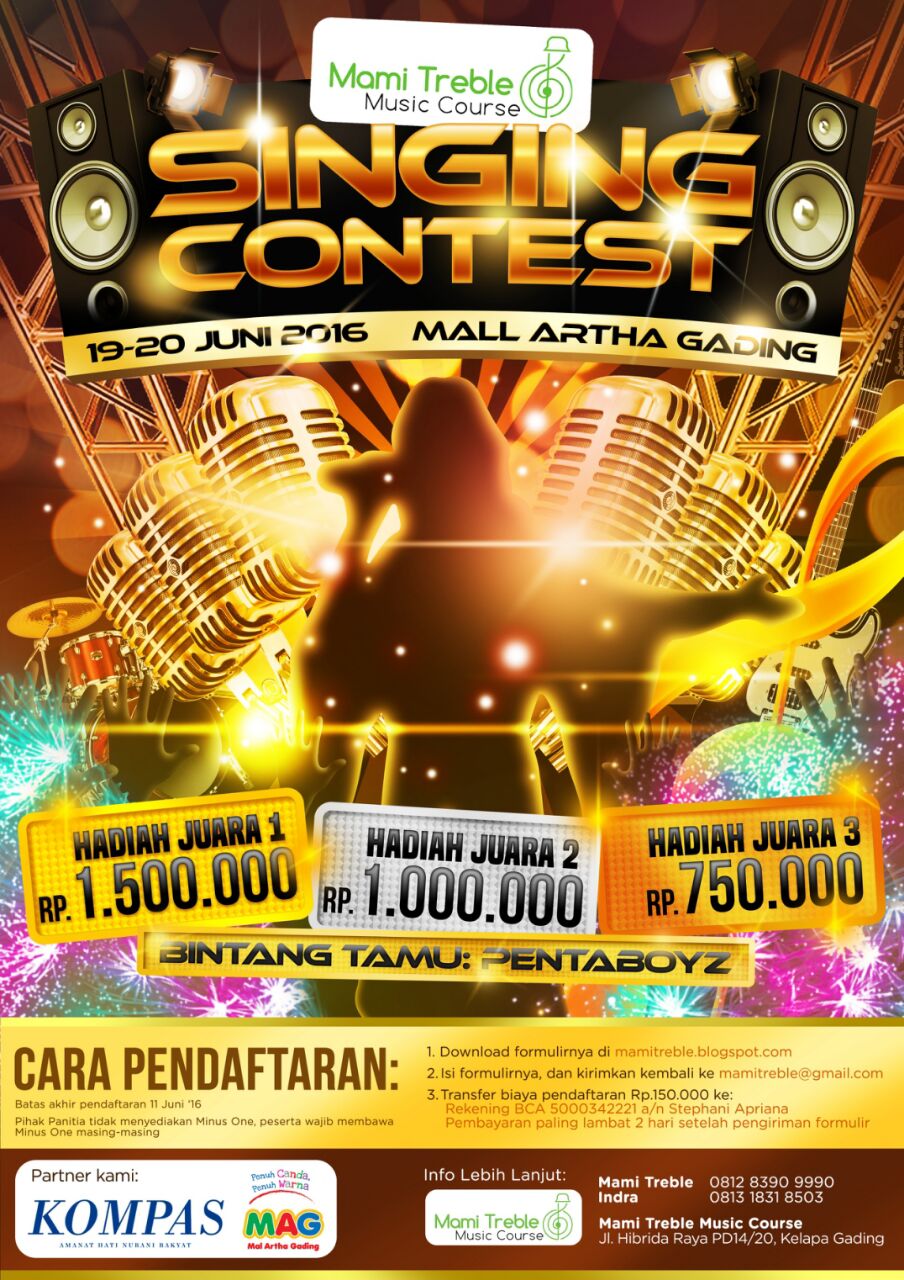 Untuk kesekian kalinya, Mami Treble akan menyelenggarakan event yaitu Lomba Solo Vokal yang akan diadakan di Mal Artha Gading tanggal 19-20 Juni 2016 nih guys. Ayo buruan ikutan kompetisi menyanyi yang akan mengasah kemampuan kalian dalam bidang tarik suara dan tentunya menambah kepercayaan diri kalian. Kapan lagi menyalurkan hobi kalian dan mendapatkan hadiah. Apa aja sih yang didapat dari lomba ini ???